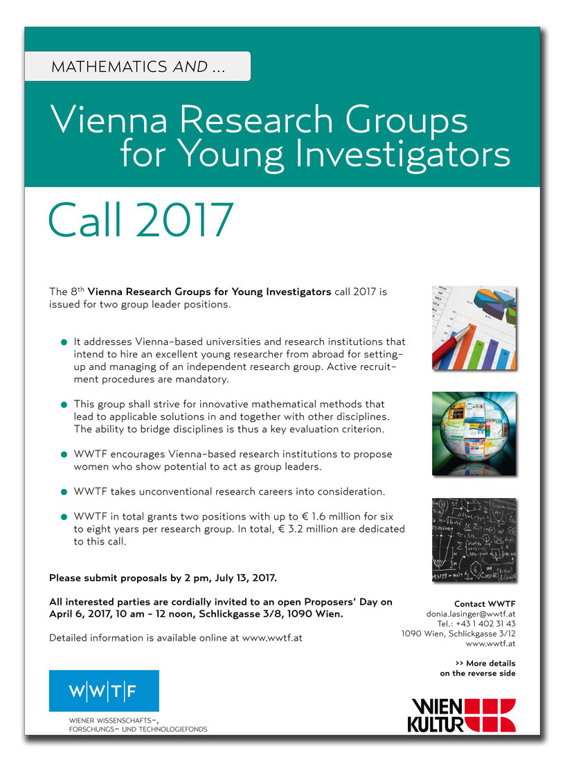Die Ausschreibung spricht Wiener Universitäten und Forschungseinrichtungen an, die exzellente junge ForscherInnen aus dem Ausland nach Wien holen wollen, um eine unabhängige Forschungsgruppe aufzubauen. Die Bewerbung erfolgt im Tandem, d.h. ein/e Wiener Proponent/in (in der Regel ein/e an der Wiener Institution gut etablierte/r Wissenschafter/in) bewirbt sich mit einem/r selbst rekrutierten Partner/in. Im Mittelpunkt der Bewerbung stehen potenzielle GruppenleiterInnen, die innovative mathematische Methoden mit Anwendungsperspektive in Bezug auf andere Disziplinen behandeln.